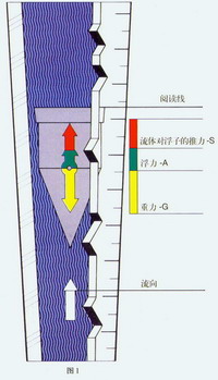 浮子式流量計是一種變面積式流量計,它通常具有一段直立的錐管和一只可以在其中自由的隨流量大小上下移動的浮子(如圖1)。當流體自下而上流經錐管時,流體的動能在浮子上產生的推力S和流體的浮力A使浮子上升。隨著錐管內壁與浮子之間的環形流通面積增大,流體動能在浮子上產生的推力S隨之下降。當推力S與浮力之和等于浮子自身重力G時,浮子處于平衡,并穩定在某一高度上,該高度位置對應的刻度指示流過流量計的流量。