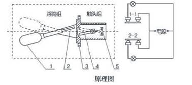 控制器由浮筒組與觸頭組二大部分組成。當被測液位升高或降低時,浮筒(1)隨之升降,使用其端部的磁鋼(2)上下擺動,通過磁力排斥安裝在外殼(3)內相同磁極的磁鋼(4)上下擺動。其另一端的觸頭(5)便在靜觸壯舉1—1,及2—2間連通或斷開,隨即在電路中的信號裝置發出光或聲的信號,或啟閉電動泵供液或收液。