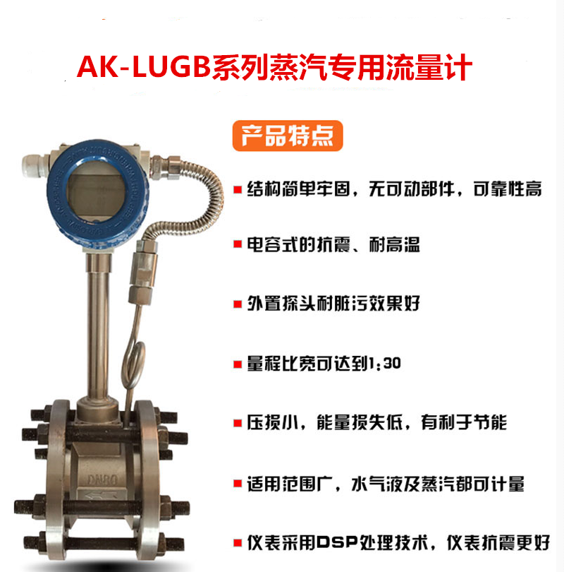 蒸汽流量計無可動部件,可靠性高,長期運行十分可靠。安裝簡單,維護十分方便。檢測傳感器不直接接觸被測介質,性能穩定,壽命長。輸出是與流量成正比的脈沖信號,無零點漂移,精度高。測量范圍寬,量程比可達1:10。 壓力損失較小,運行費用低,更具節能意義。 在一定的雷諾數范圍內,輸出信號頻率不受流體物理性質和組份變化的響,儀表系數僅與旋渦發生體的形狀和尺寸有關,測量流體體積流量時無需補償,調換配件后一般無需重新標定儀表系數。 應用范圍廣,蒸汽、氣體、液體的流量均可測量。 檢定周期為二年。